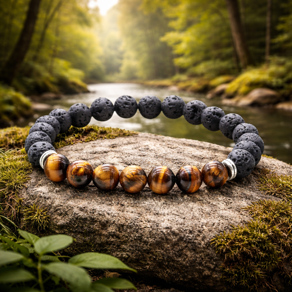 Bracelet en Œil de Tigre et Pierre de Lave - Homme (Protection contre le mauvais œil et les intentions négatives, Apaisement, Contre l'anxiété, Soulagement des tensions, Harmonie, Vitalité) 13,00 € 0,00 €