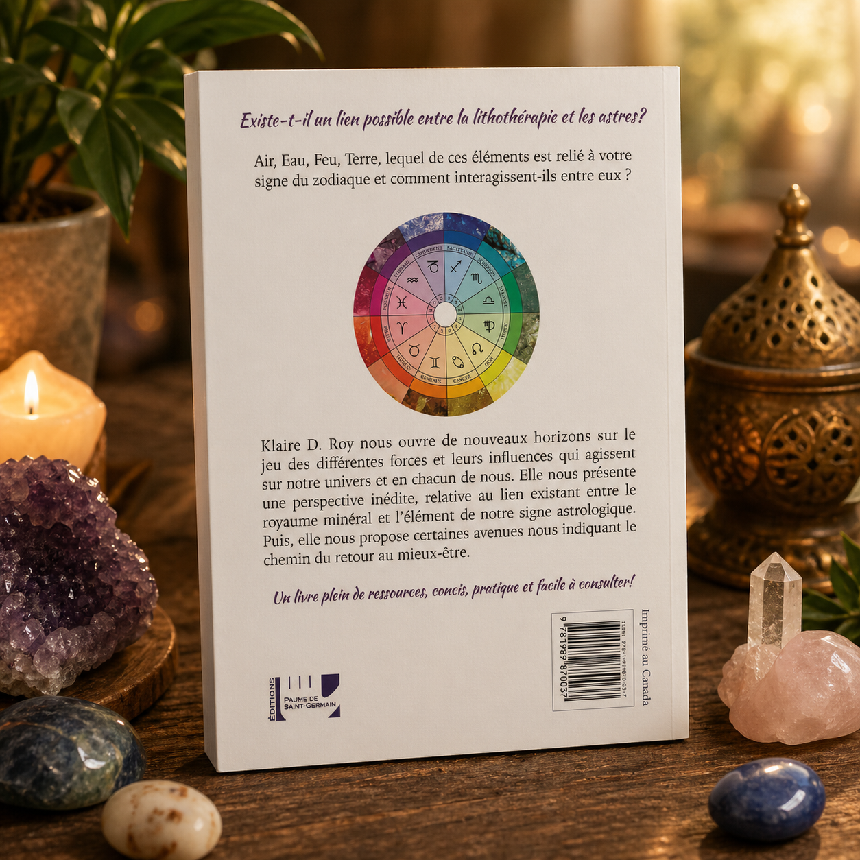 Klaire D. Roy nous ouvre de nouveaux horizons sur le jeu des différentes forces et leurs influences qui agissent sur notre univers et en chacun de nous. Elle nous présente une perspective inédite, relative au lien existant entre le royaume minéral et l'élément de notre signe astrologique. Puis, elle nous propose certaines avenues nous indiquant le chemin du retour au mieux-être. Un livre plein de ressources, concis, pratique, tout en couleur, facile à consulter !