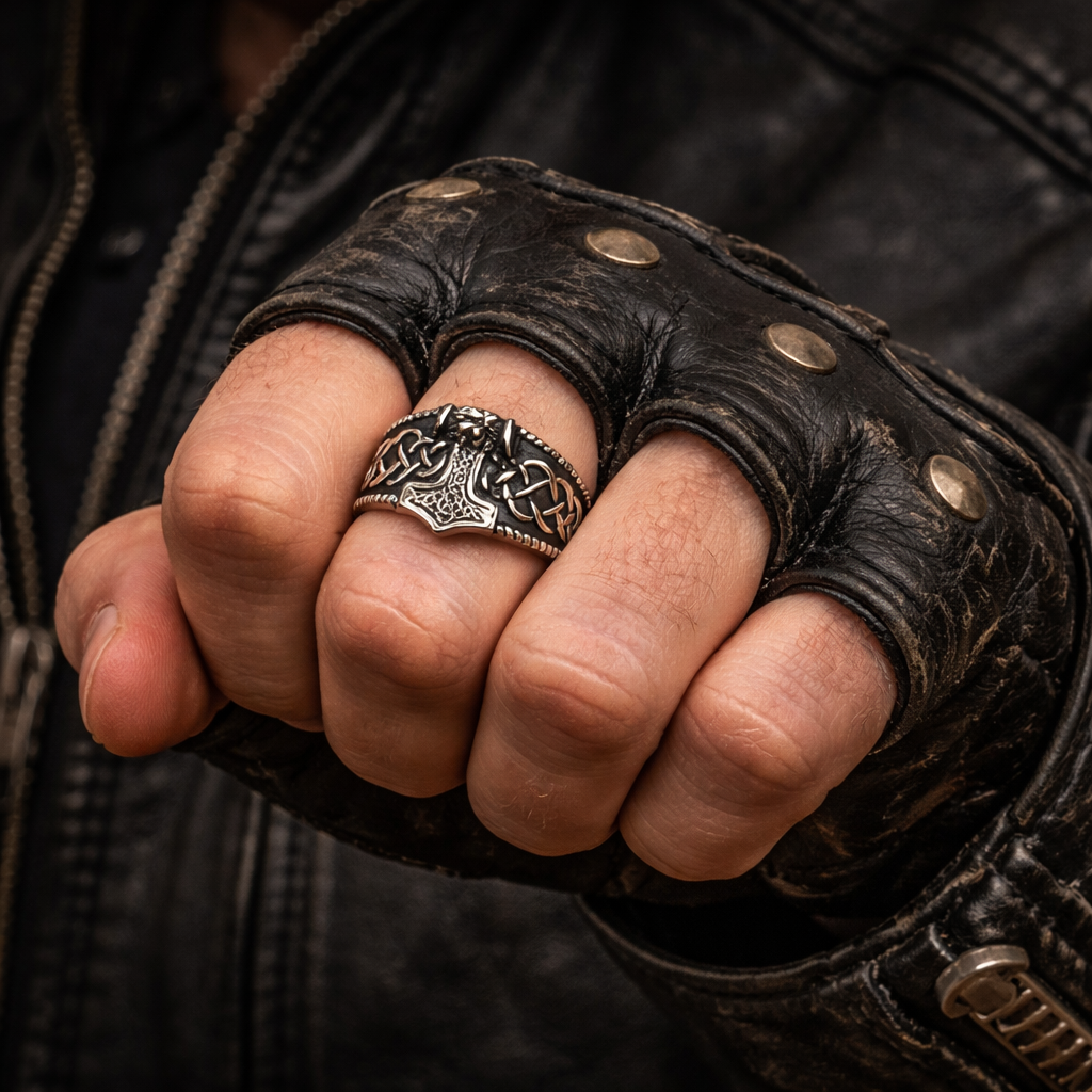Cette bague représente le marteau légendaire Mjöllnir, symbole de force et de protection dans la mythologie nordique. Le marteau est magnifiquement orné de motifs complexes inspirés des traditions vikings.