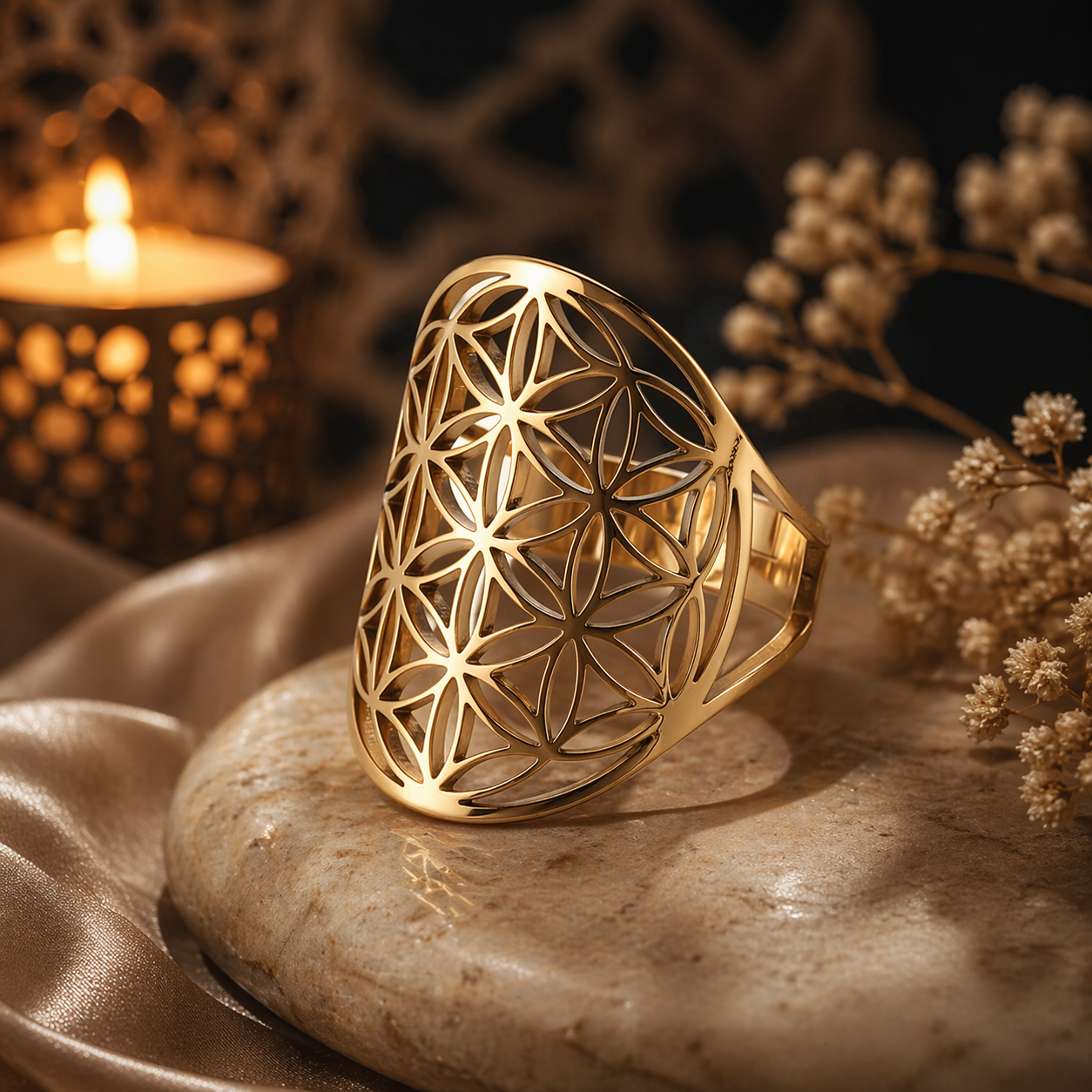 Bague réglable ornée du symbole sacré de la Fleur de Vie, reconnue pour représenter l'harmonie, l'équilibre et la protection.