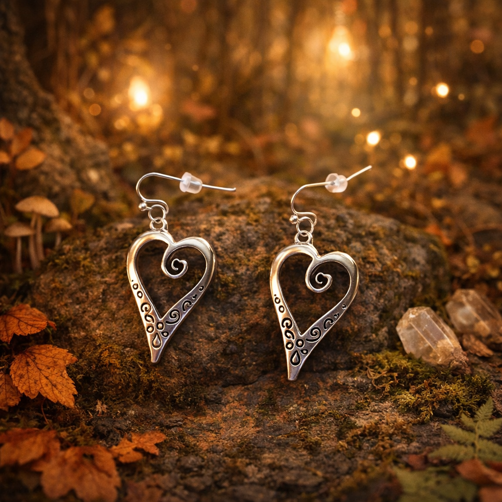 Boucles d'oreilles couleur argent en forme de cœur ajouré, délicatement ornées de motifs spiralés d'inspiration celtique. Élégantes et lumineuses, elles allient douceur romantique et énergie féerique pour sublimer votre style avec une touche subtilement ésotérique.