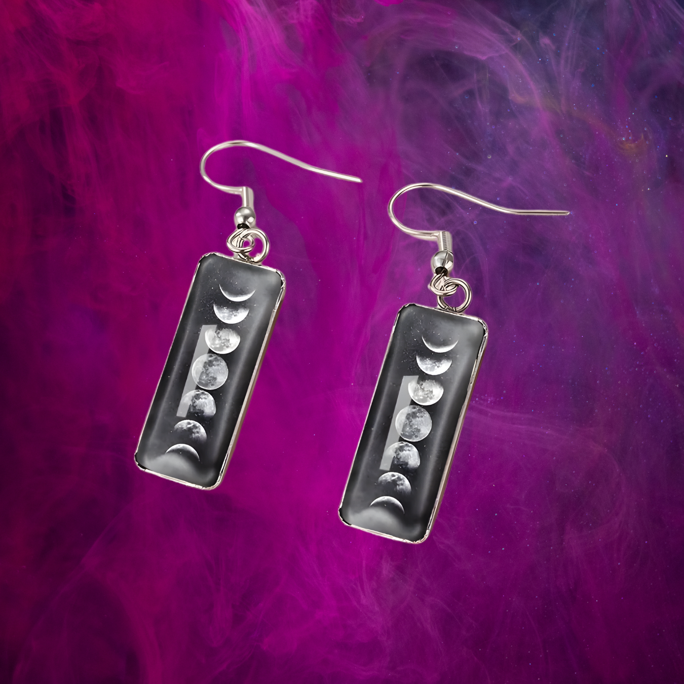 Ces boucles d'oreilles raffinées mettent en lumière les différentes phases de la Lune, sublimées dans un design vertical moderne et mystique. La goutte en verre offre un bel effet de profondeur et magnifie le motif lunaire, tandis que la structure en acier inoxydable assure durabilité et confort au quotidien.