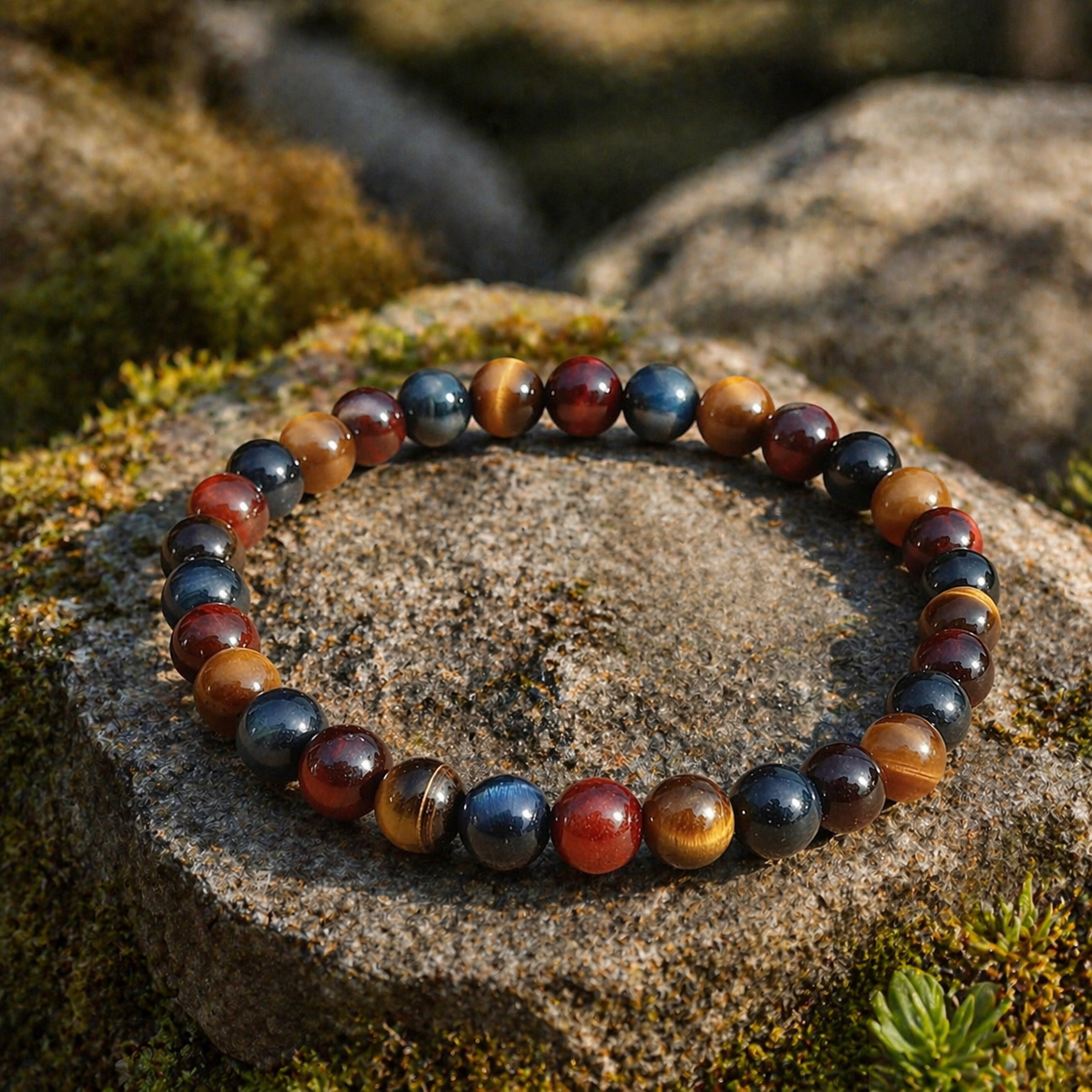 Bracelet en perles d'un diamètre de 8mm, composé d'Œil de Tigre, d'Œil de Faucon et d'Œil de Taureau