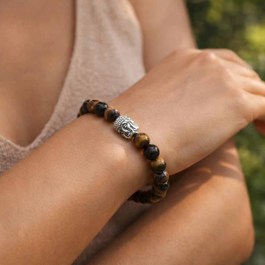 Bracelet en perles d'un diamètre de 8mm, orné d'une tête de Bouddha argentée. Agit sur l'émotionnel et le spirituel. Régule le don d'empathie. Protège du mauvais œil et des intentions négatives. Combat la dépression et rend plus optimiste. Réduit les peurs et favorise la création. Apaise les douleurs articulaires des jambes et genoux, renforce le métabolisme, diminue les crises d'asthme. Stabilise l'hypertension, régénère les tissus, régule l'acidité gastrique.