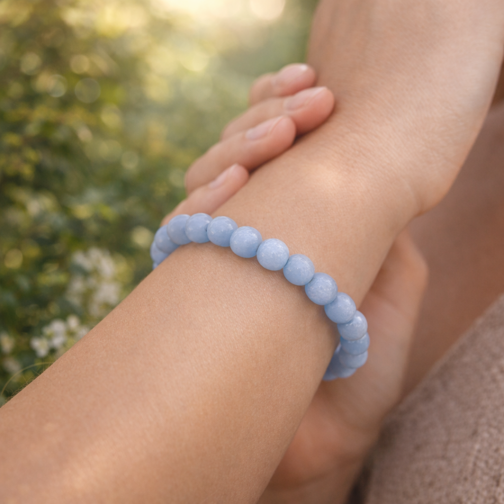 Un magnifique bracelet élastiqué en Angélite (Perles 8mm)