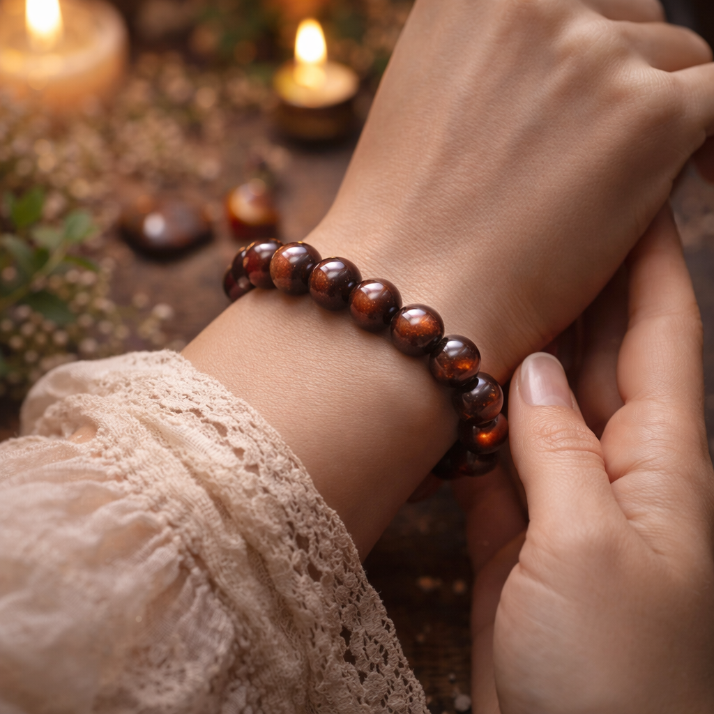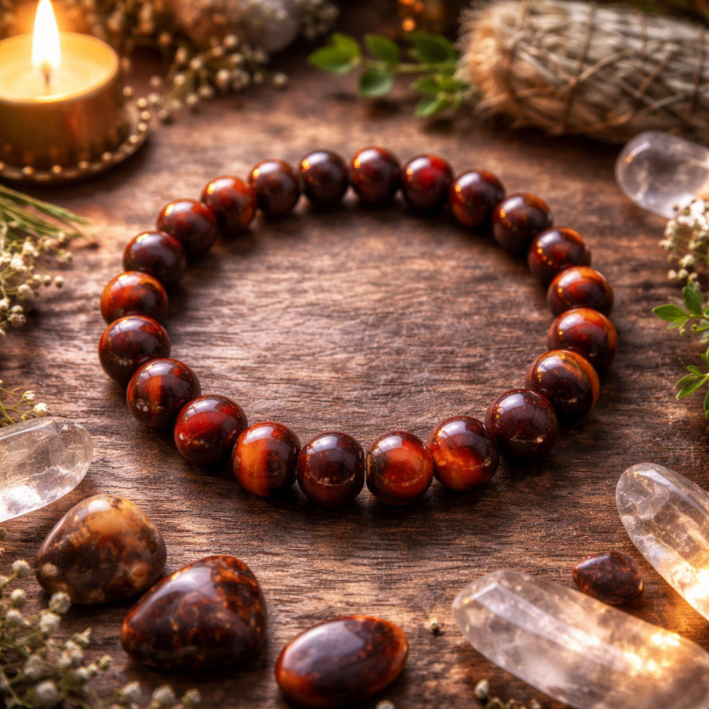 Pierre de force et d'ancrage, l'Œil de Taureau est une variété d'œil de tigre aux reflets brun-rouge profonds. Il est reconnu pour renforcer le courage, la détermination et la confiance en soi, tout en aidant à rester stable face aux tensions extérieures. Sur le plan énergétique, il agit comme un bouclier protecteur, repoussant les énergies négatives et favorisant la maîtrise de soi et l'endurance, notamment en période de stress ou de fatigue. Traditionnellement, l'Œil de Taureau est également apprécié pour aider à soulager les douleurs liées aux os, aux articulations et au dos, en apportant une énergie de soutien et de solidité au corps. C'est une pierre associée à la force intérieure, la persévérance et la stabilité, idéale pour avancer sans se laisser déstabiliser.