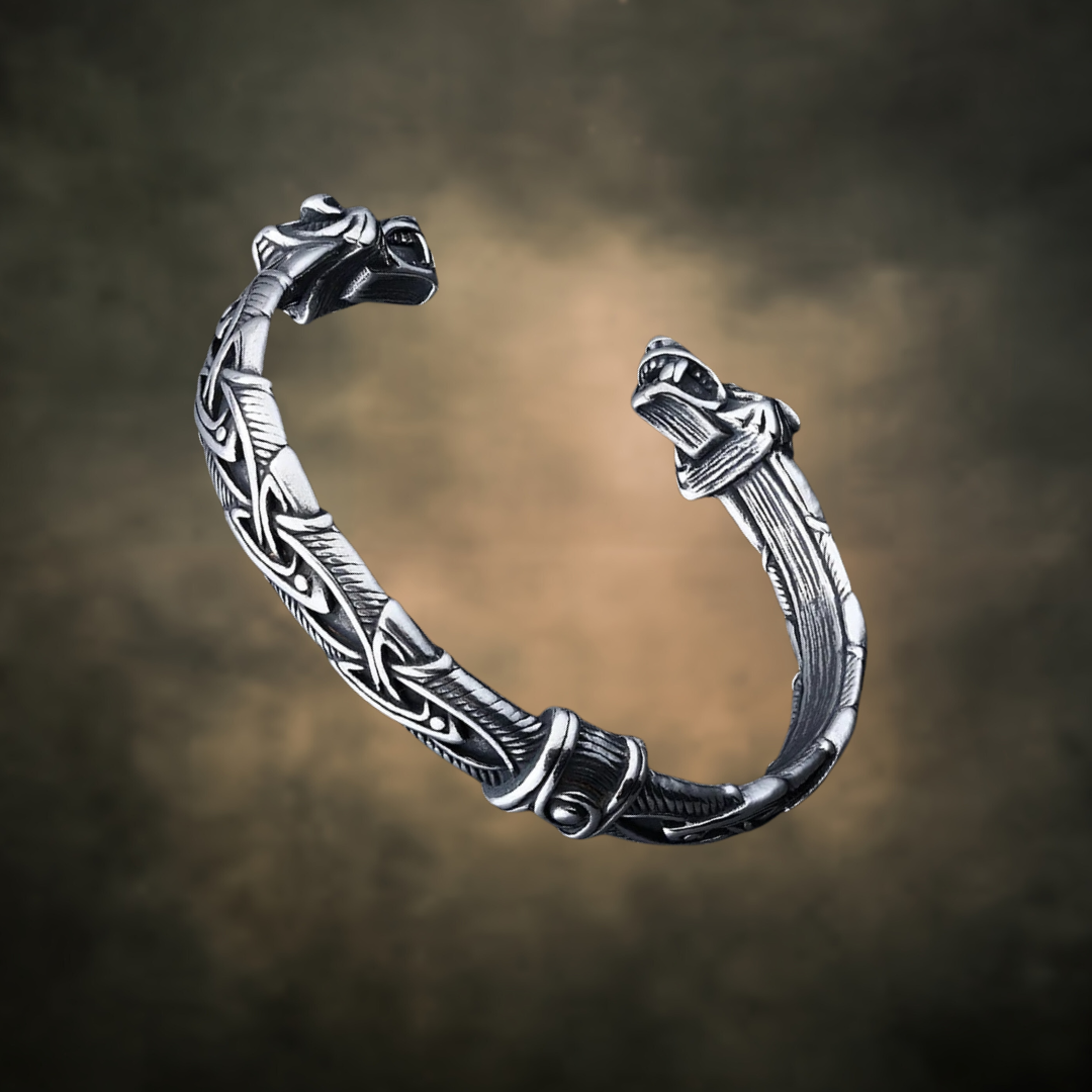 Le bracelet présente de magnifiques motifs d'inspiration nordique finement ciselés, rappelant les entrelacs vikings et les ornements runiques anciens. Ses extrémités en forme de têtes de loups lui confèrent une allure puissante et protectrice.