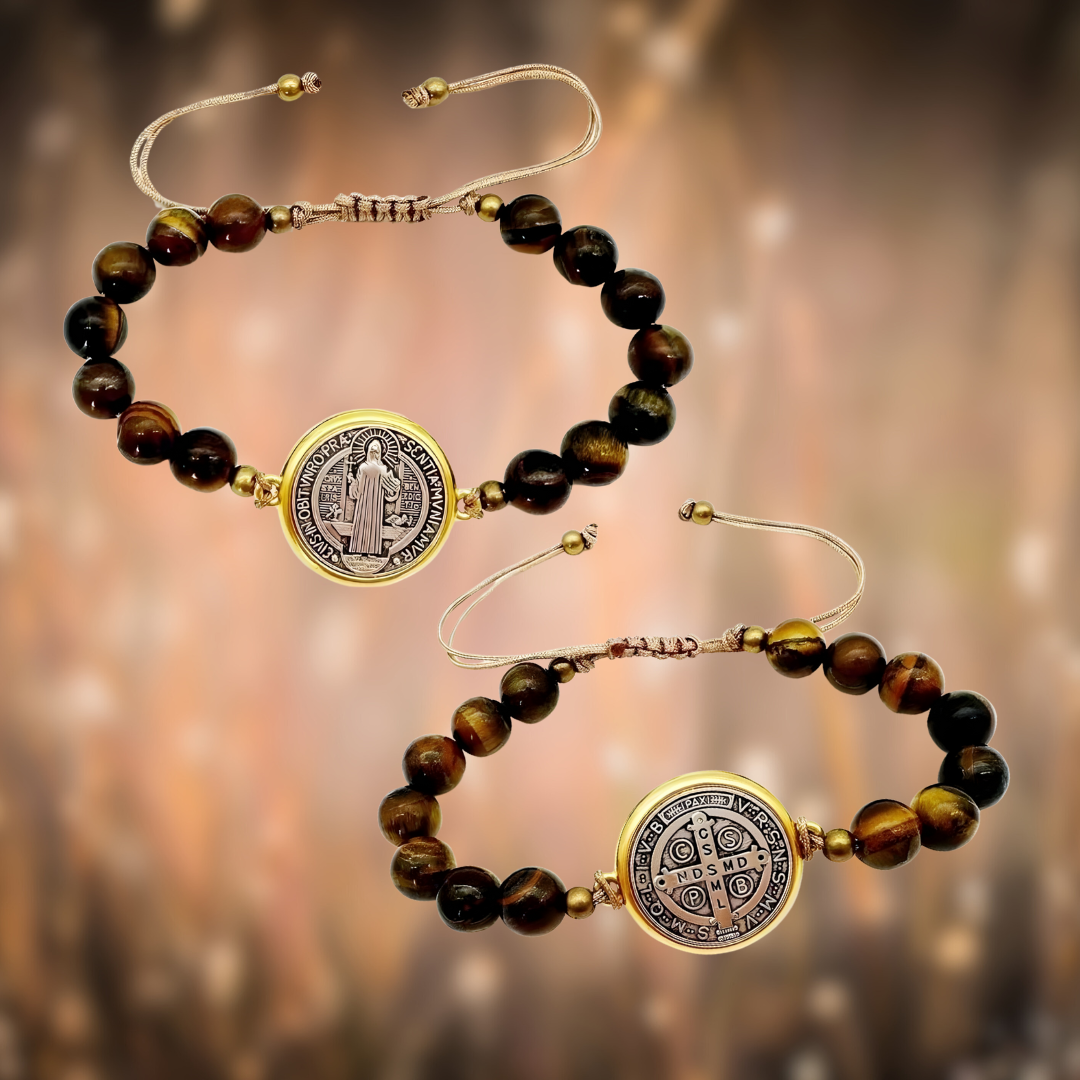 Ce bracelet spirituel associe force, ancrage et protection. Il est composé de perles naturelles d'Œil de Tigre de 8 mm, pierre reconnue pour repousser les énergies négatives et renforcer la confiance en soi. En son centre se trouve la médaille de Saint Benoît, grand patron des exorcistes et symbole universel de protection contre le mal, les influences néfastes et les forces obscures.