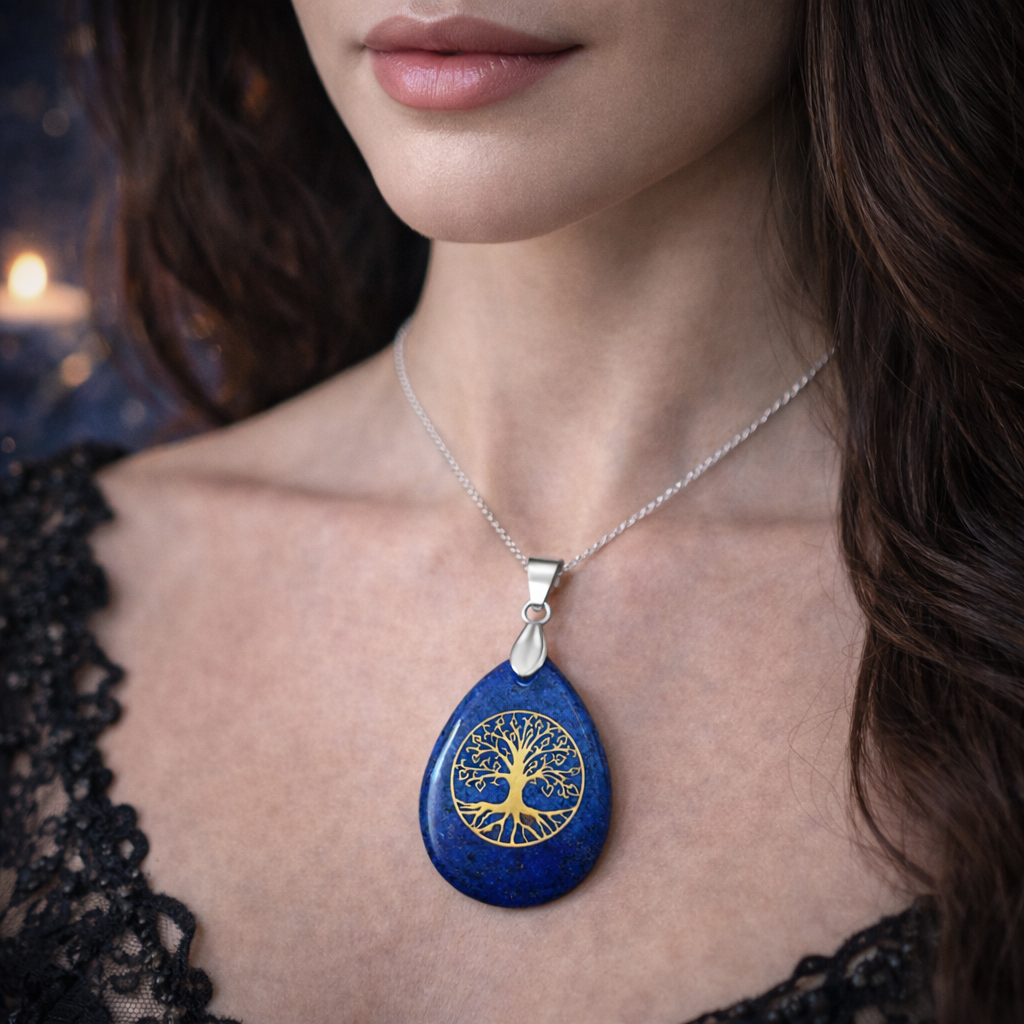 Magnifique collier composé d'une pierre en Lapis Lazuli polie, sur laquelle se trouve un motif Arbre de Vie doré