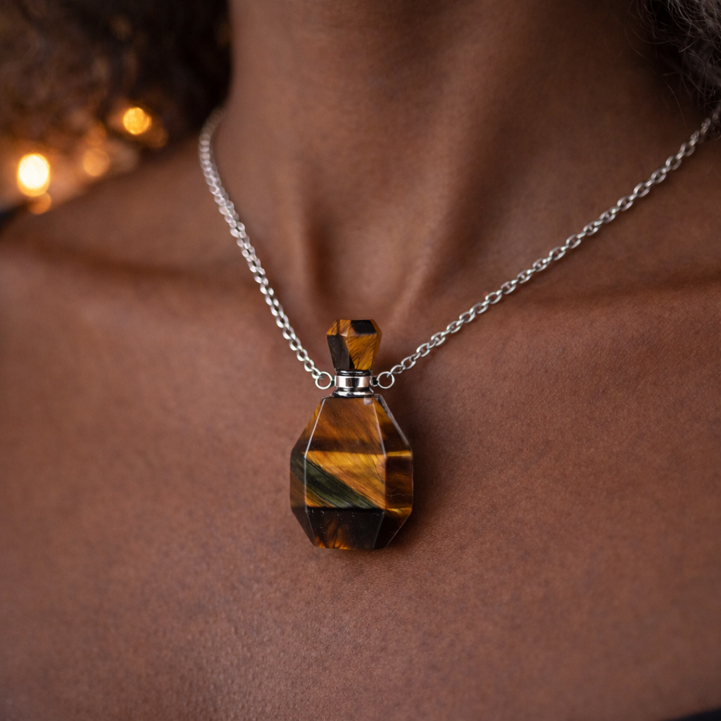 Collier en acier inoxydable, couleur argent, longueur 45cm, avec pendentif flacon de parfum en Œil de Tigre facetté.