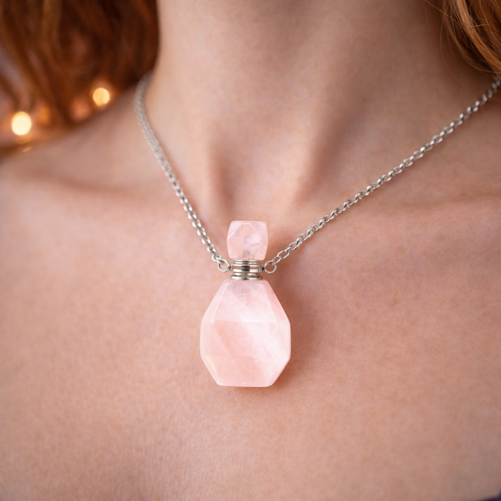 Collier en acier inoxydable, couleur argent, longueur 45cm, avec pendentif flacon de parfum en Quartz Rose facetté.