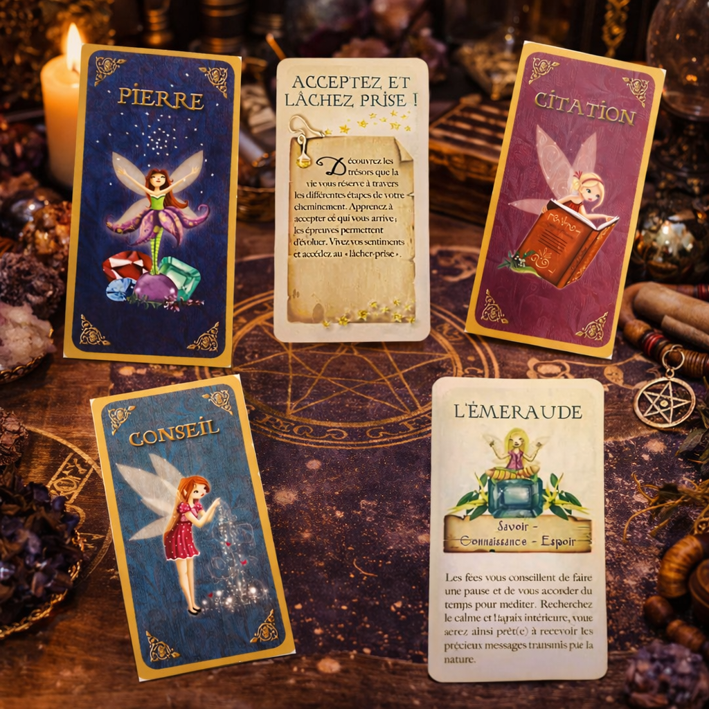Description du coffret : Chaque carte renferme un message bienveillant : soit une citation vibrante pour accompagner votre journée, soit une pierre bienfaisante pour guider vos émotions, soit un conseil de fée pour améliorer votre bien-être ! Avec le concours de ces petits êtres fantastiques, il vous appartient de déverrouiller les portes de votre coeur et de raviver ainsi la flamme qui scintille au plus profond de votre âme. Un coffret enchanteur qui délivre conseils et citations pour se sentir bien !