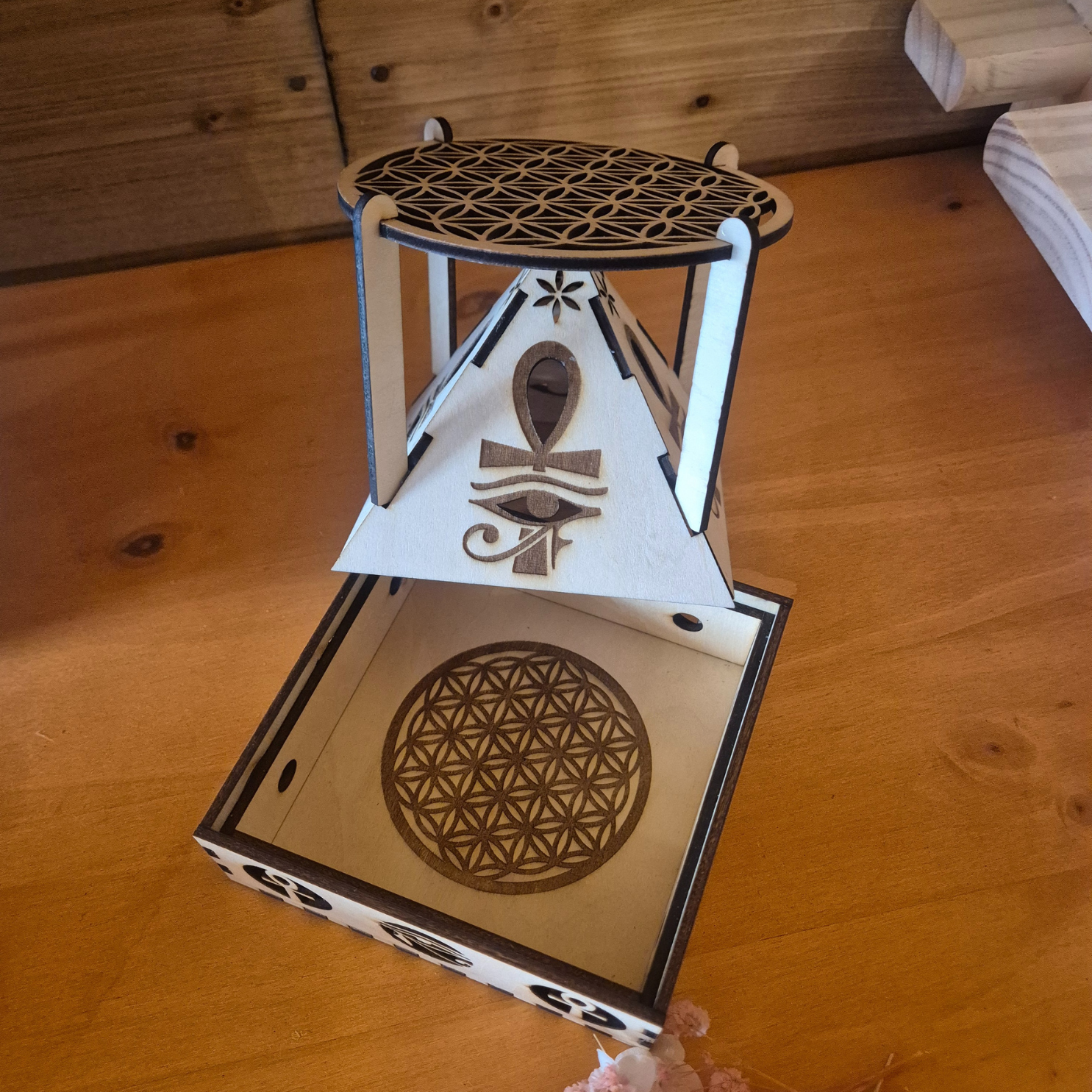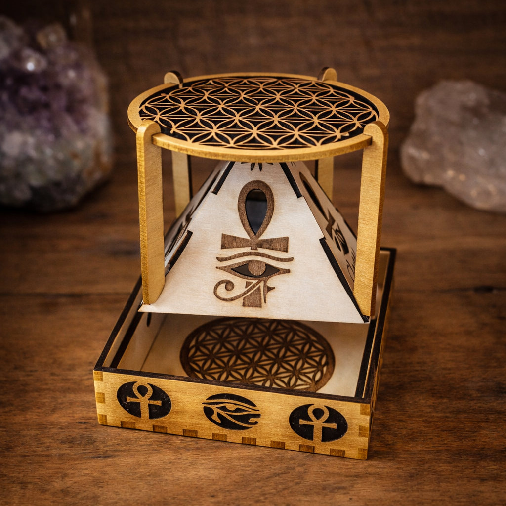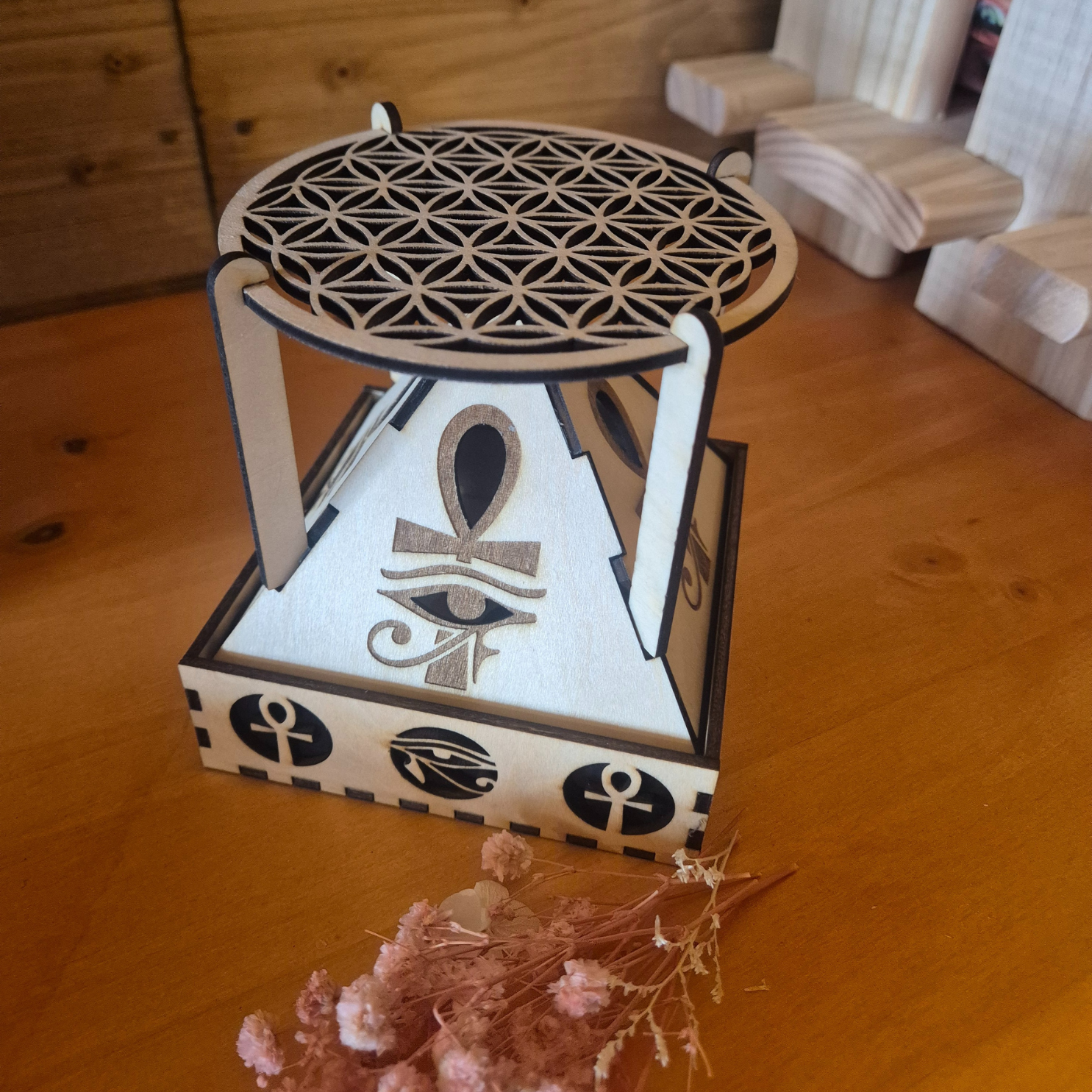 Ce superbe encensoir/énergétiseur a été entièrement réalisé dans notre atelier, grâce à une découpe et une gravure minutieuses du bois. Sa structure met en valeur de puissants symboles égyptiens : l'Œil d'Horus, l'Ankh et d'autres motifs protecteurs, gravés avec précision sur chaque face. La Fleur de Vie vient couronner l'ensemble, apportant harmonie et élévation vibratoire.