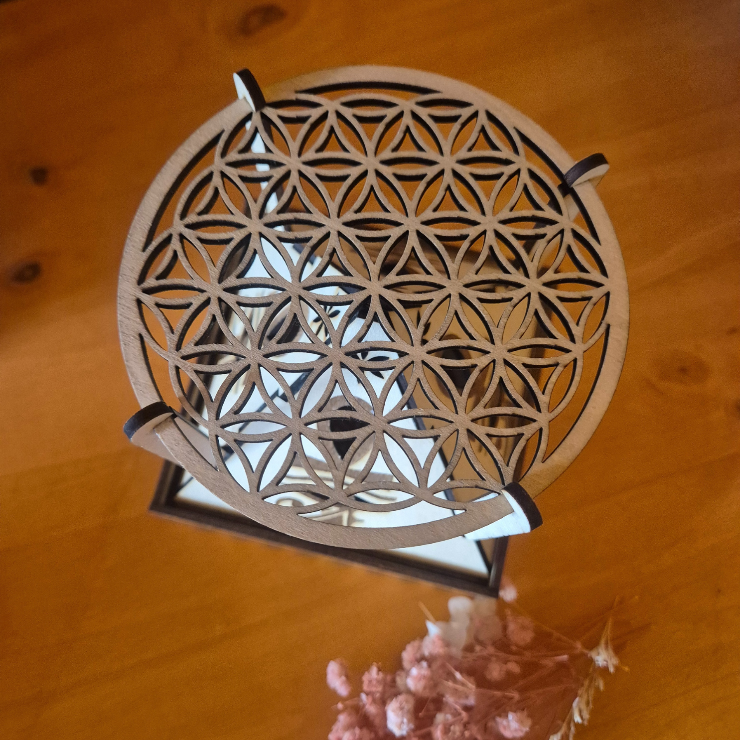Le plateau supérieur en Fleur de Vie sert également de support pour vos minéraux ou bijoux. Pendant la diffusion, ils se purifient et se rechargent en douceur, enveloppés par l'énergie conjuguée des symboles sacrés et de la fumigation.