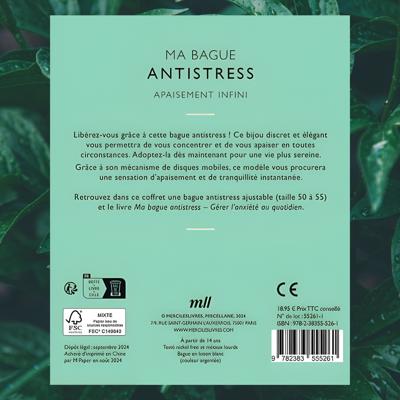 Libérez-vous grâce à cette bague antistress ! Ce bijou discret et élégant vous permettra de vous concentrer et de vous apaiser en toutes circonstances. Adoptez-la dès maintenant pour une vie plus sereine. Grâce à son mécanisme de disques mobiles, ce modèle vous procurera une sensation d'apaisement et de tranquillité instantanée. Retrouvez dans ce coffret une bague antistress ajustable (taille 50 à 55) et le livre Ma bague antistress - Gérer l'anxiété au quotidien.