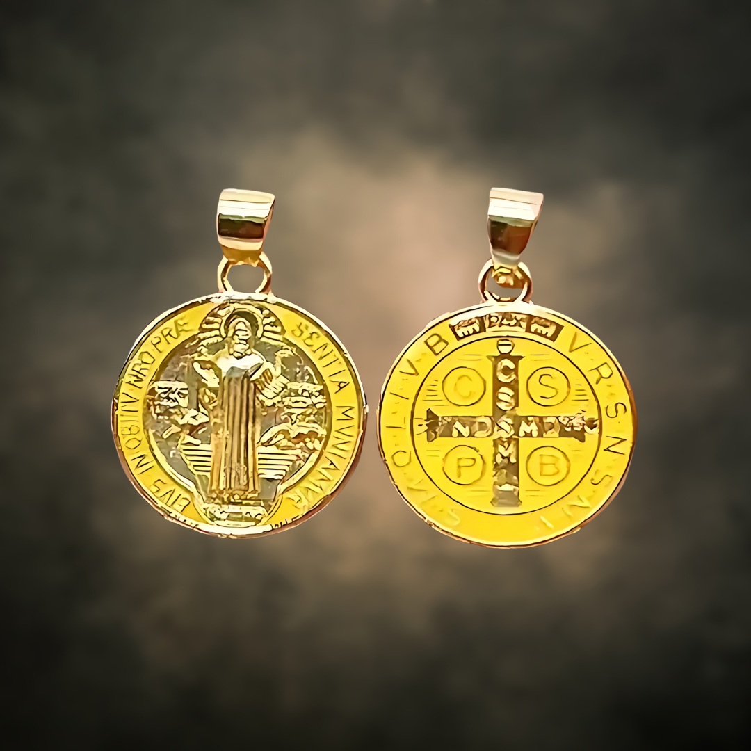 Sur une face figure l'image de Saint Benoît tenant la croix et le livre de la règle monastique, symboles de la foi et de la sagesse. Au revers, se trouve la croix de Saint Benoît entourée d'inscriptions latines sacrées telles que "Crux Sacra Sit Mihi Lux" (Que la Sainte Croix soit ma lumière) et "Non Draco Sit Mihi Dux" (Que le dragon ne soit pas mon guide). Ces lettres, accompagnées d'autres formules de bénédiction, sont réputées pour leur pouvoir de protection contre le mal et les tentations.