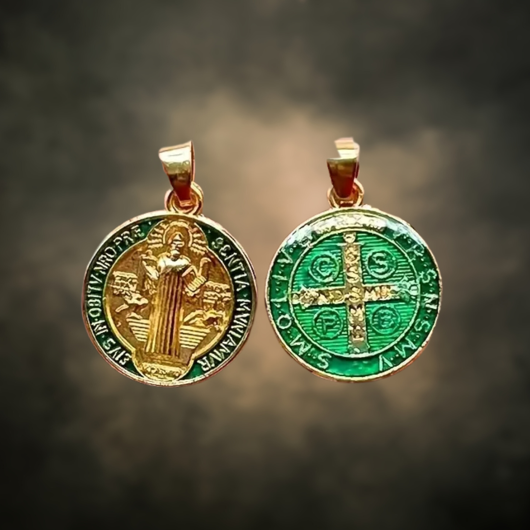 Sur une face figure l'image de Saint Benoît tenant la croix et le livre de la règle monastique, symboles de la foi et de la sagesse. Au revers, se trouve la croix de Saint Benoît entourée d'inscriptions latines sacrées telles que "Crux Sacra Sit Mihi Lux" (Que la Sainte Croix soit ma lumière) et "Non Draco Sit Mihi Dux" (Que le dragon ne soit pas mon guide). Ces lettres, accompagnées d'autres formules de bénédiction, sont réputées pour leur pouvoir de protection contre le mal et les tentations.