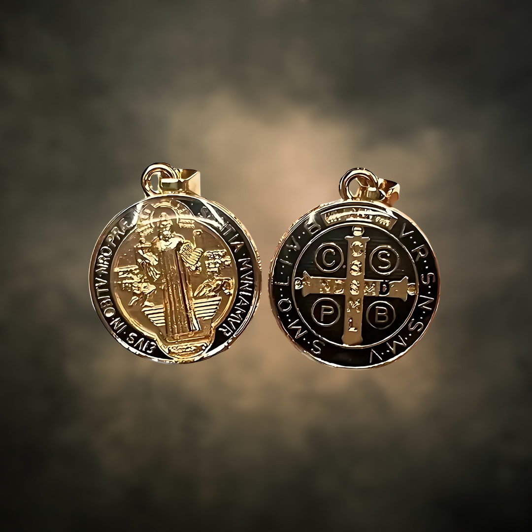 Sur une face figure l'image de Saint Benoît tenant la croix et le livre de la règle monastique, symboles de la foi et de la sagesse. Au revers, se trouve la croix de Saint Benoît entourée d'inscriptions latines sacrées telles que "Crux Sacra Sit Mihi Lux" (Que la Sainte Croix soit ma lumière) et "Non Draco Sit Mihi Dux" (Que le dragon ne soit pas mon guide). Ces lettres, accompagnées d'autres formules de bénédiction, sont réputées pour leur pouvoir de protection contre le mal et les tentations.