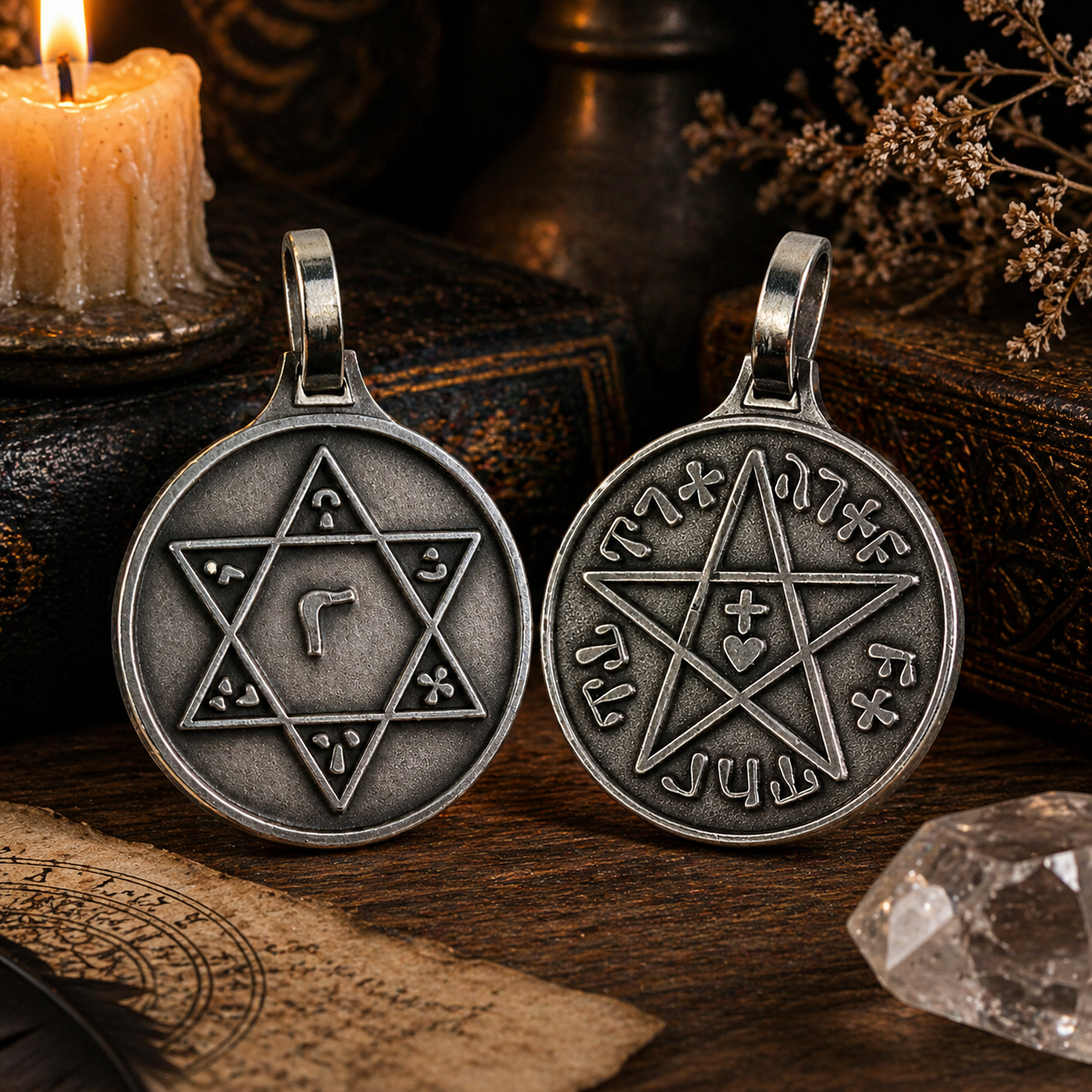 Très puissant talisman de protection, contre les maladies, les influences nocives, les ennemis cachés, les envoûtements, les malédictions.Caractéristiques : Argenté - 2,3 cm - Gravé recto-verso