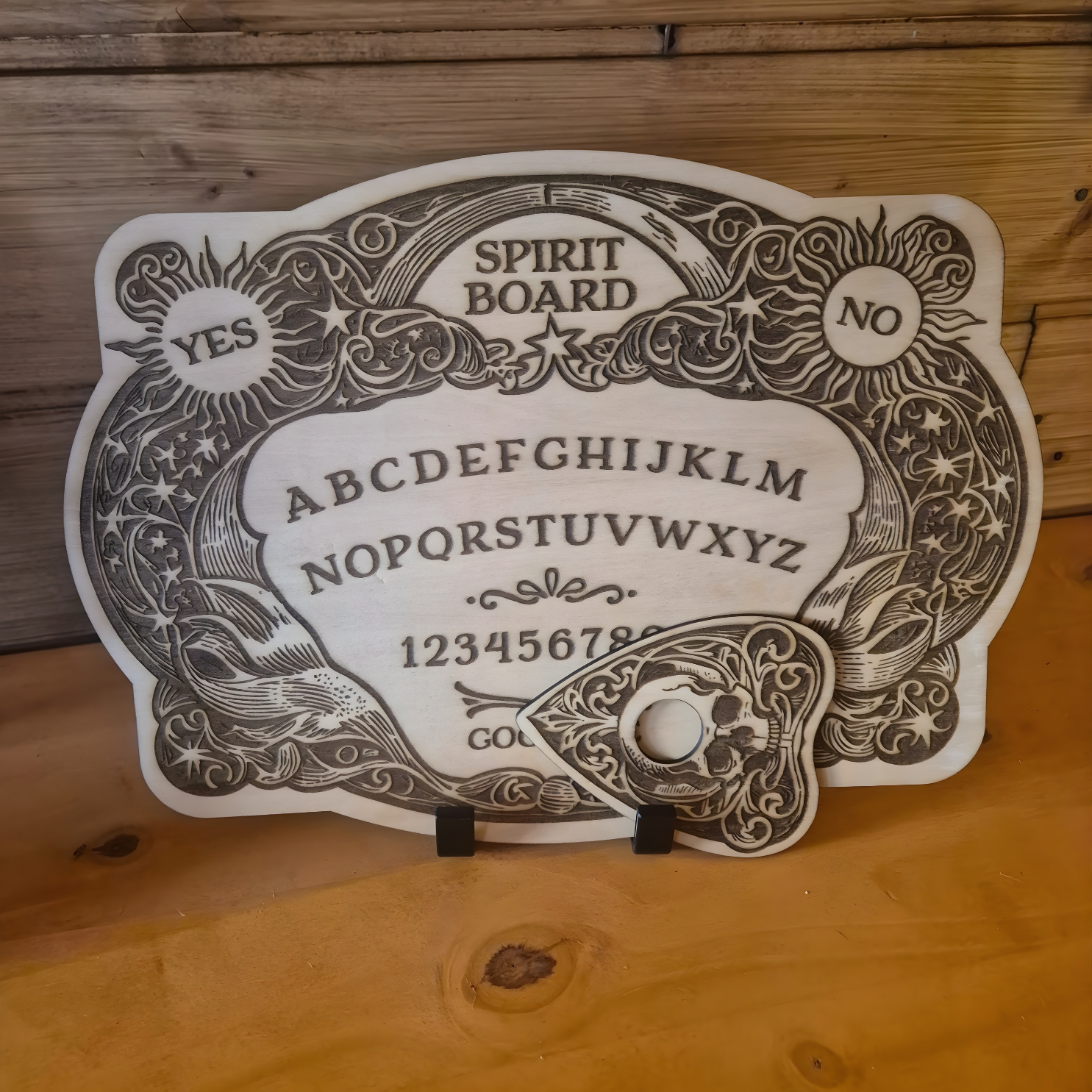 La planchette assortie reprend le même style délicat et se déplace facilement sur la surface grâce à la légèreté naturelle du bouleau. L'ensemble crée une atmosphère douce et mystérieuse, idéale pour les séances de spiritisme, les pratiques divinatoires ou simplement pour la décoration d'un espace ésotérique.
