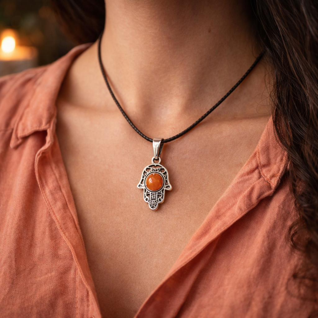 Une Main de Fatima, ornée de Jaspe, combine protection et ancrage. Pierre de stabilité et de force, cette pierre amplifie l'énergie protectrice du symbole, tout en favorisant le courage, l'équilibre émotionnel et la connexion avec la terre. Idéal pour se sentir en sécurité et centré.