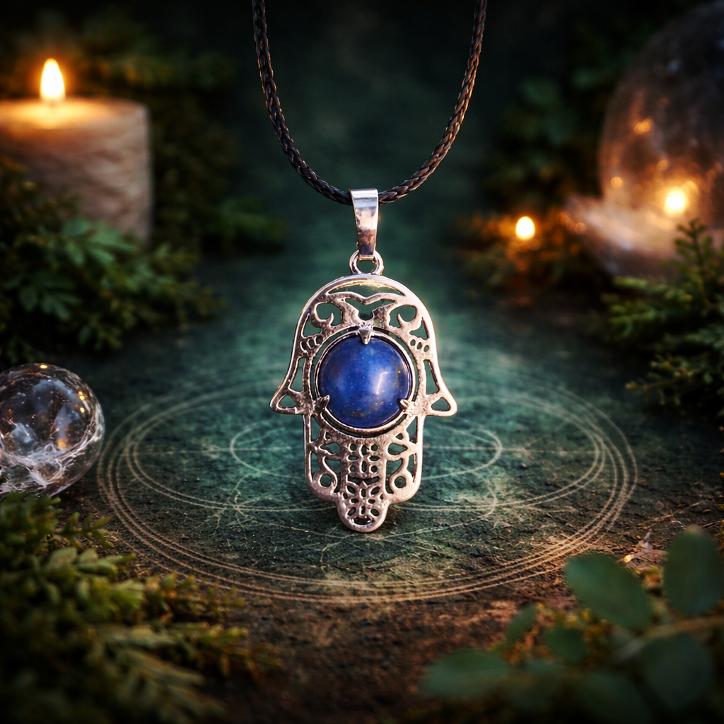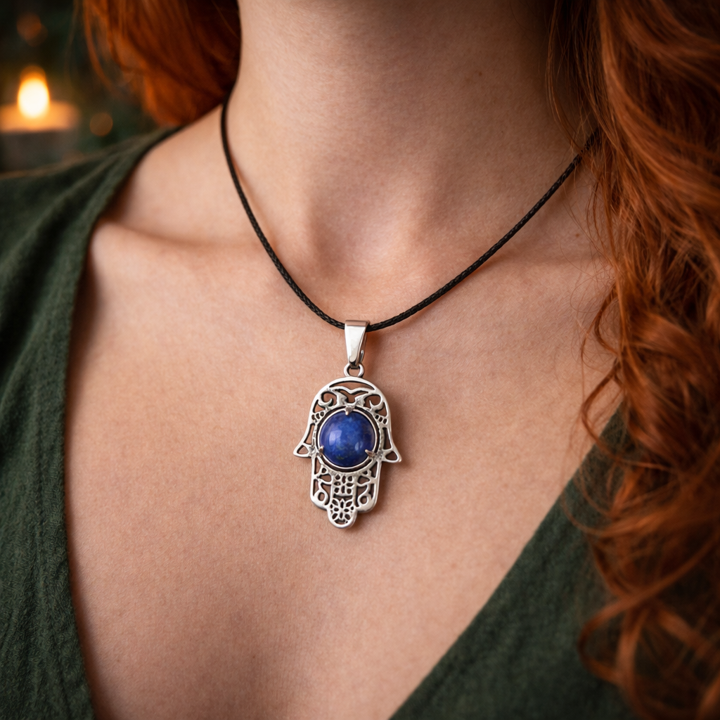Une Main de Fatima, ornée de Lapis-Lazuli représente la protection spirituelle et la sagesse. Pierre de vérité et de connexion spirituelle, elle amplifie les énergies intuitives du symbole tout, en favorisant la clarté mentale et l'harmonie intérieure. C’est une combinaison idéale pour la protection et l’éveil spirituel.