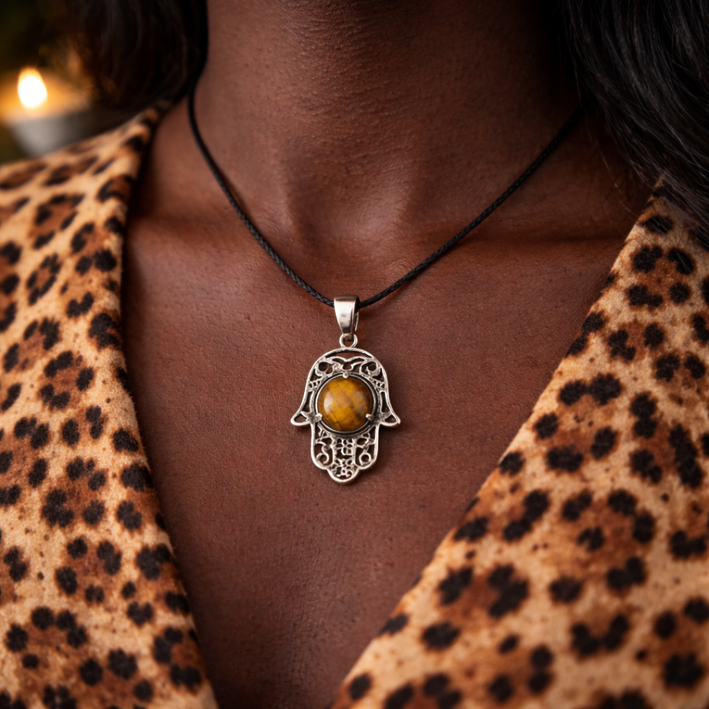 Une Main de Fatima, avec de l'Œil de Tigre, symbolise la protection, la chance et la force. Il s'agit d'une pierre d'équilibre et de courage, qui renforce les énergies protectrices du symbole, tout en favorisant la confiance en soi, la clarté mentale et l'harmonie entre le corps et l'esprit.