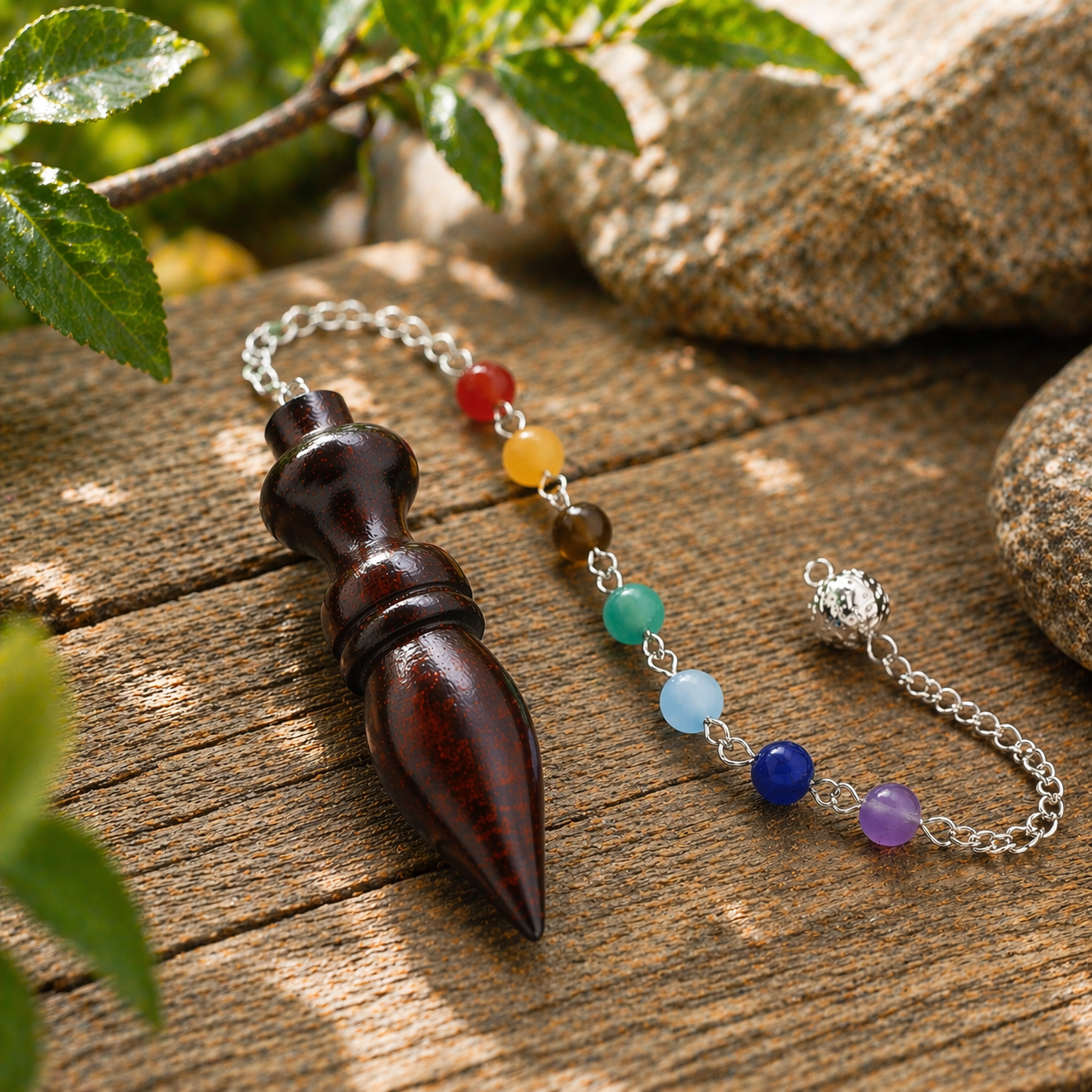 Le bois de noyer, noble et naturel, apporte solidité, équilibre et ancrage lors des pratiques énergétiques. La chaîne est ornée de sept perles colorées représentant les chakras, ce qui favorise l'harmonisation et la circulation fluide des énergies.