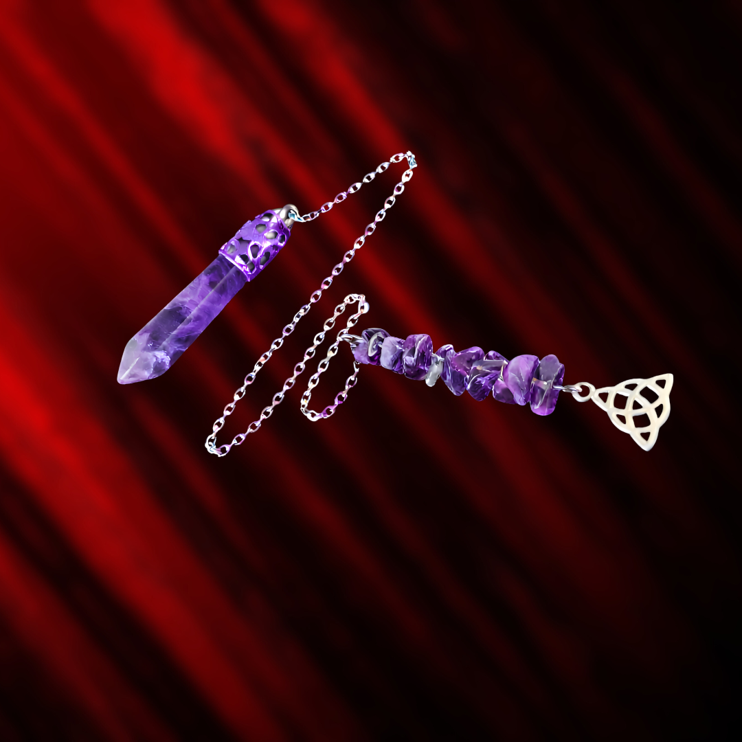 Chaque pendule est unique, les teintes et marbrures de l'améthyste pouvant légèrement varier, ce qui en fait un objet authentique et personnel, idéal pour accompagner une pratique ésotérique quotidienne.