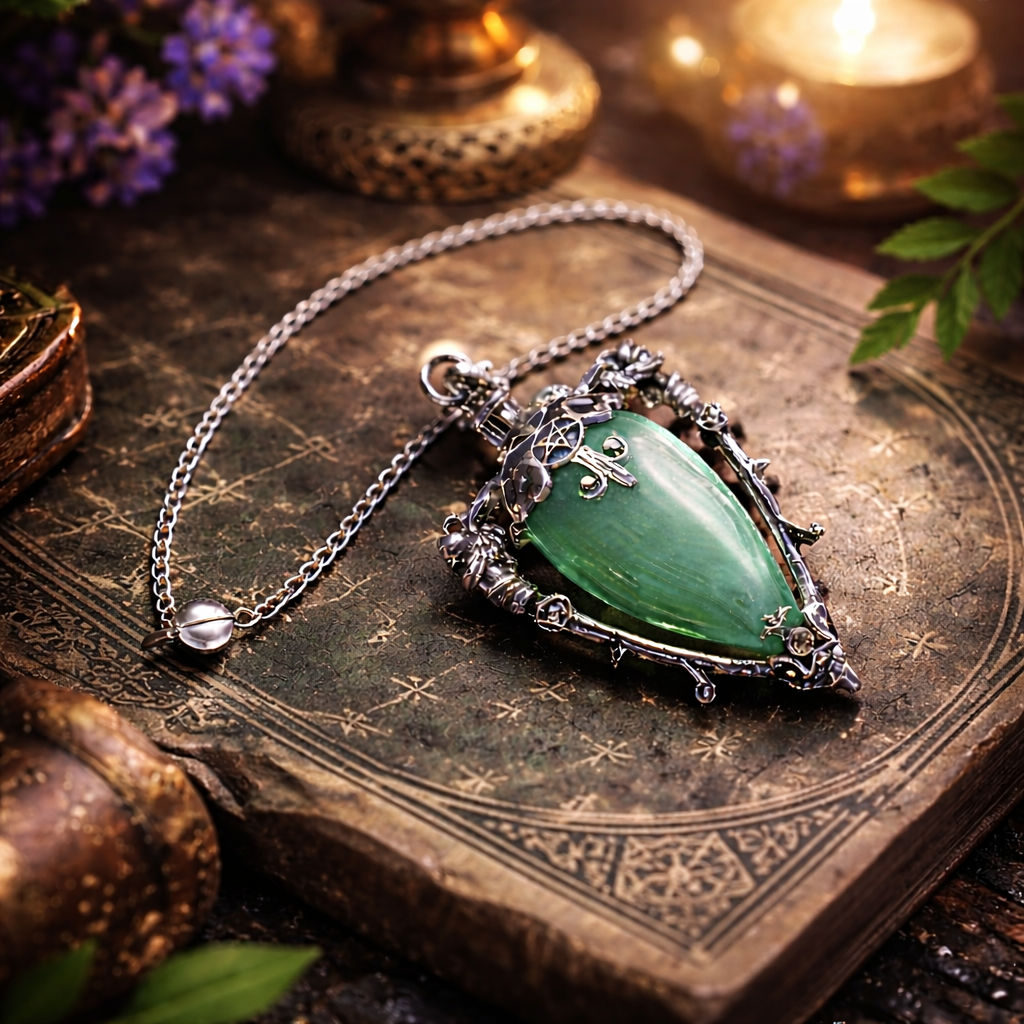 Le Pendule "Nocturna" en Aventurine est une pièce profondément marquée par l'esthétique gothique et l'univers wicca. Son cœur de pierre naturelle, d'un vert doux et apaisant, est enveloppé dans une monture argentée finement travaillée, rappelant les symboles anciens et les ornements occultes. Ce pendule se distingue autant par son allure ténébreuse que par la précision de son mouvement
