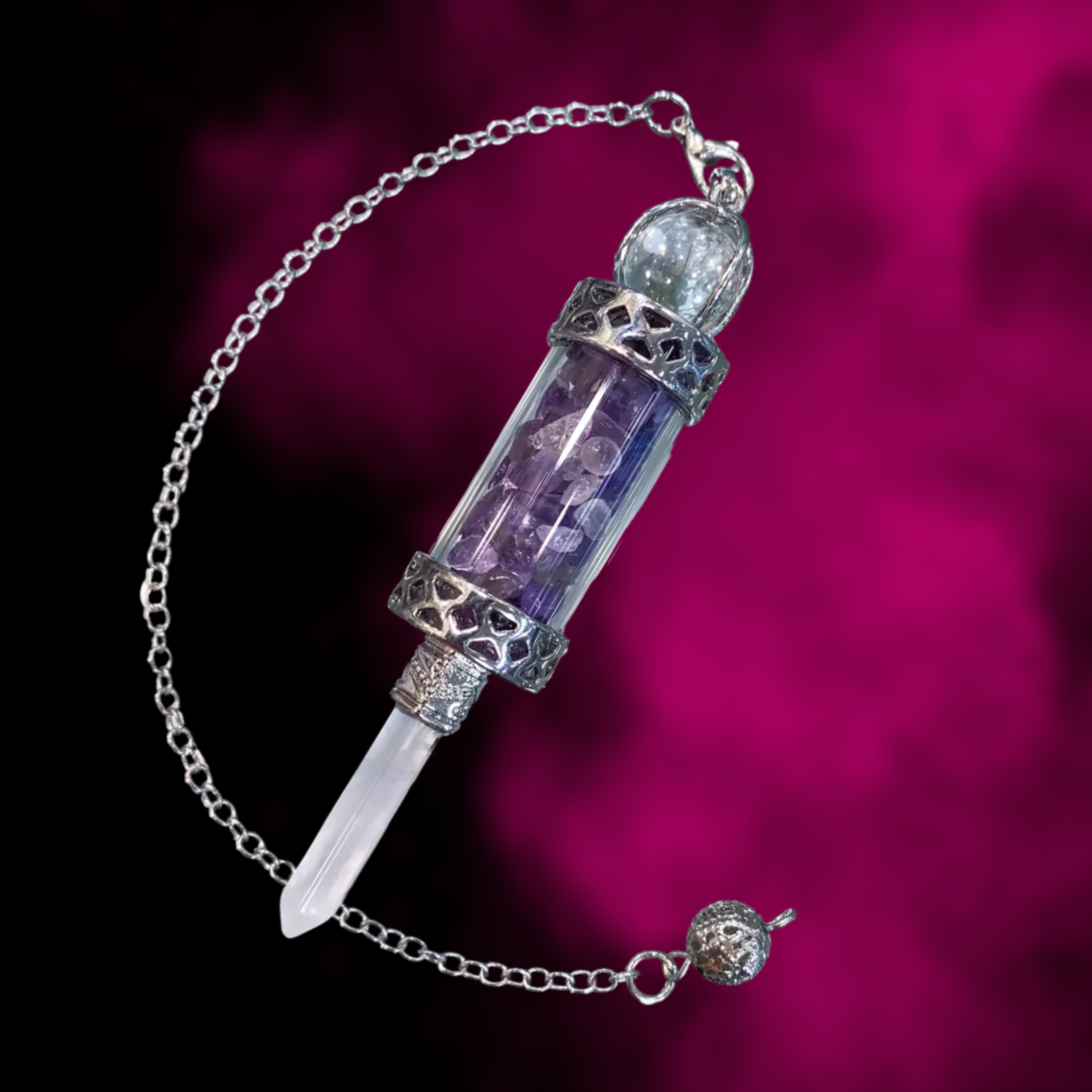 Le Pendule Voile d'Aether associe l'améthyste et le cristal de roche, deux pierres reconnues pour leur complémentarité énergétique. L'améthyste favorise l'intuition, l'élévation spirituelle et l'apaisement de l'esprit, tandis que le cristal de roche agit comme un amplificateur, clarifiant et harmonisant les énergies