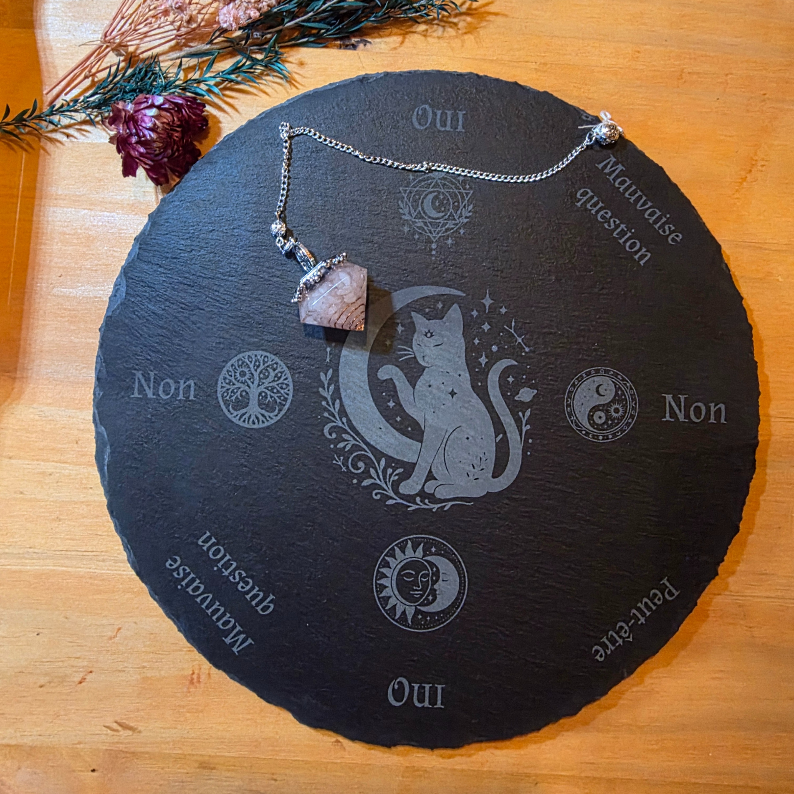 Découvrez une planche divinatoire élégante et raffinée, entièrement réalisée en ardoise naturelle et finement gravée au laser. Son diamètre de 25 cm offre une surface idéale pour pratiquer la radiesthésie avec précision.