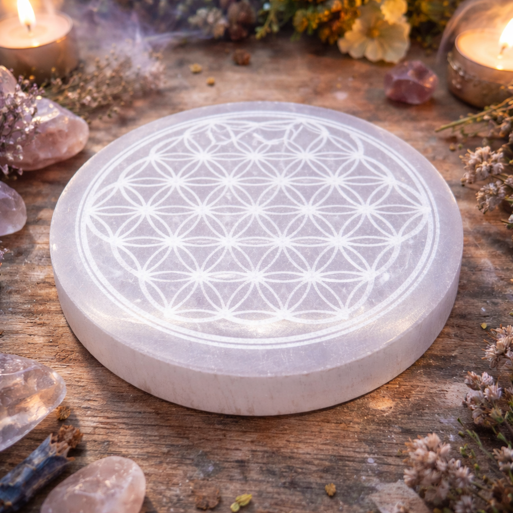 Une magnifique plaque en Sélénite naturelle, sur laquelle est gravée la Fleur de Vie.