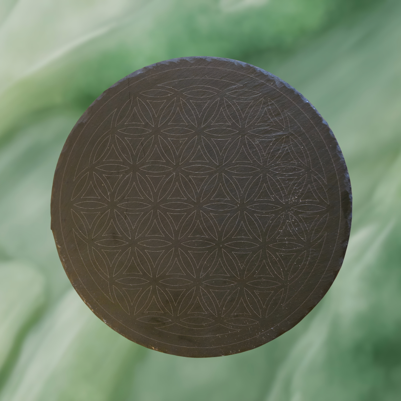 Cette magnifique plaque en ardoise naturelle de 25 cm de diamètre met en valeur une Fleur de Vie finement gravée, offrant un rendu net, harmonieux et durable.