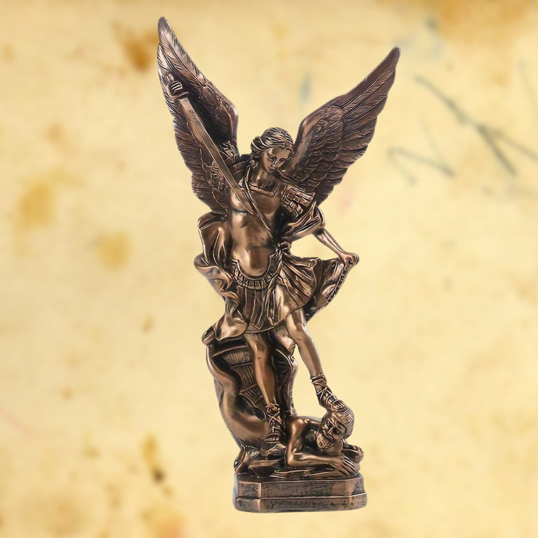 Sculptée avec un grand souci du détail, elle montre l'Archange terrassant le Diable, symbole du triomphe du bien sur le mal. Réalisée en résine de haute qualité avec une finition couleur bronze, elle allie élégance et robustesse. Ses ailes déployées, son épée levée et son regard déterminé confèrent à cette pièce une puissance spirituelle et décorative remarquable.