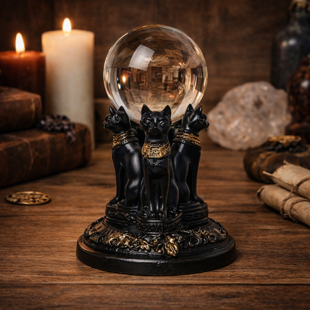 Support pour boule de cristal représentant la déesse Bastet sous sa forme triple, symbole de protection, d'intuition et de vigilance.